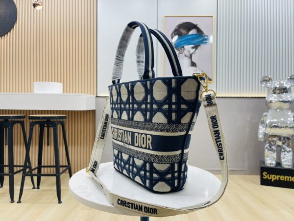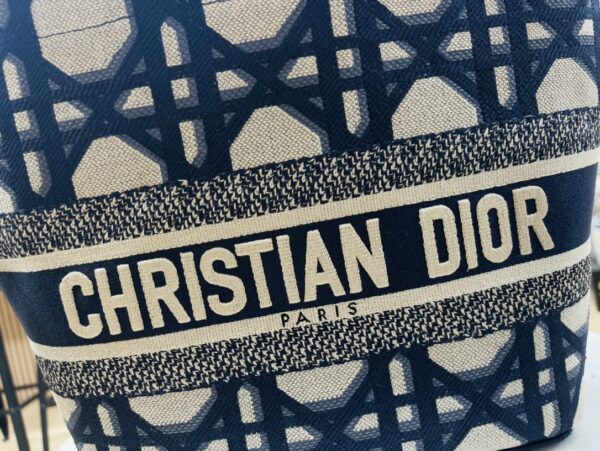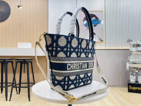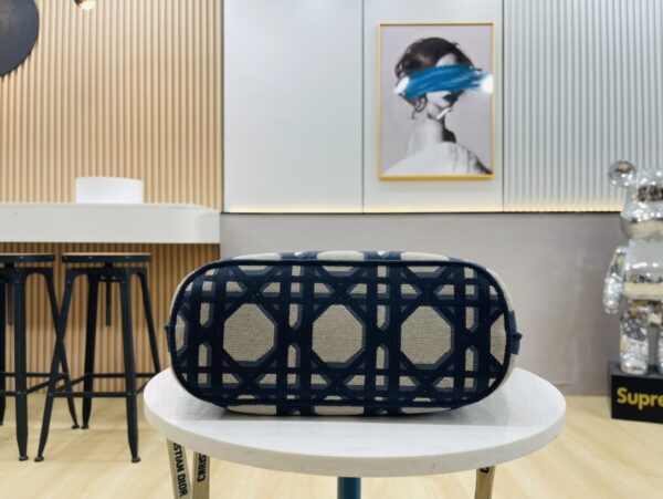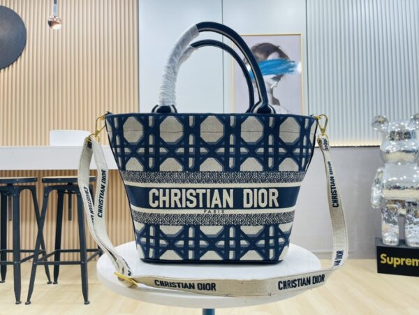 The rattan and beige canvas are interwoven with eye-catching “Christian Dior” embroidery, interpreting the exquisite attitude of holiday style. The wide silhouette accommodates beach essentials and comes with a detachable canvas storage bag, combining the casualness of a picnic basket with the craftsmanship details of luxury goods.