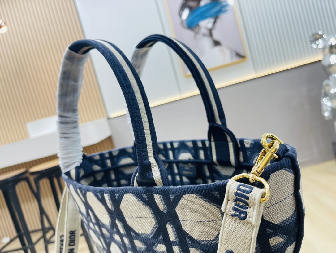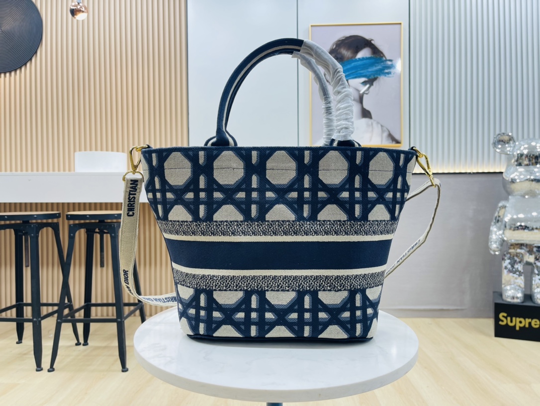 The rattan and beige canvas are interwoven with eye-catching “Christian Dior” embroidery, interpreting the exquisite attitude of holiday style. The wide silhouette accommodates beach essentials and comes with a detachable canvas storage bag, combining the casualness of a picnic basket with the craftsmanship details of luxury goods.