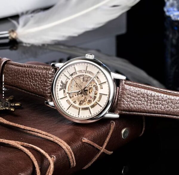 EMPORIO ARMANI Armani Mechanical Series Watch Mechanical Movement Leather Strap 42mm Hollow Dial Men’s Watch 30m Waterproof AR1982-NLP